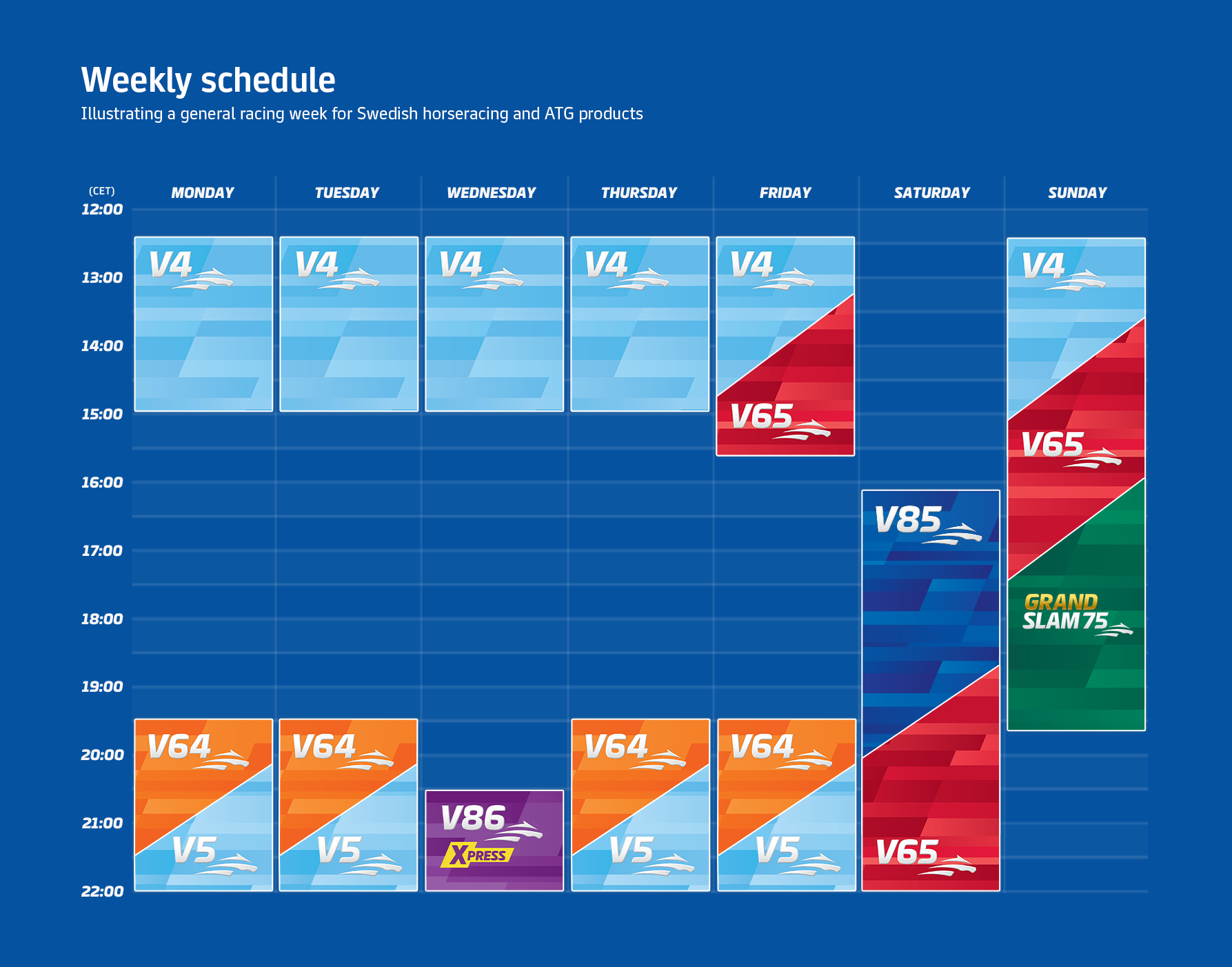 Double is offered twice every race day at various racetracks throughout Sweden. Daily Double® is offered at the track with the main product of V85®, V86®, V64® or V65® and Lunch Double is offered at day racing together with main product of V4®.